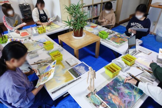 午前の想定課題は前回に続き、下地作り〜中盤戦。今はゴールを焦って絵を簡単にするのでなく、色/形/構成をああでもないこうでもないと葛藤することが大事です。その試行錯誤の跡が後々良い絵になります。勇気を持ってどんどん絵を変化させることが大事です(参考・ピカソの場合)。まだ絵がどうなるかわからない今が一番つらくも楽しい時間です。ワクワク。