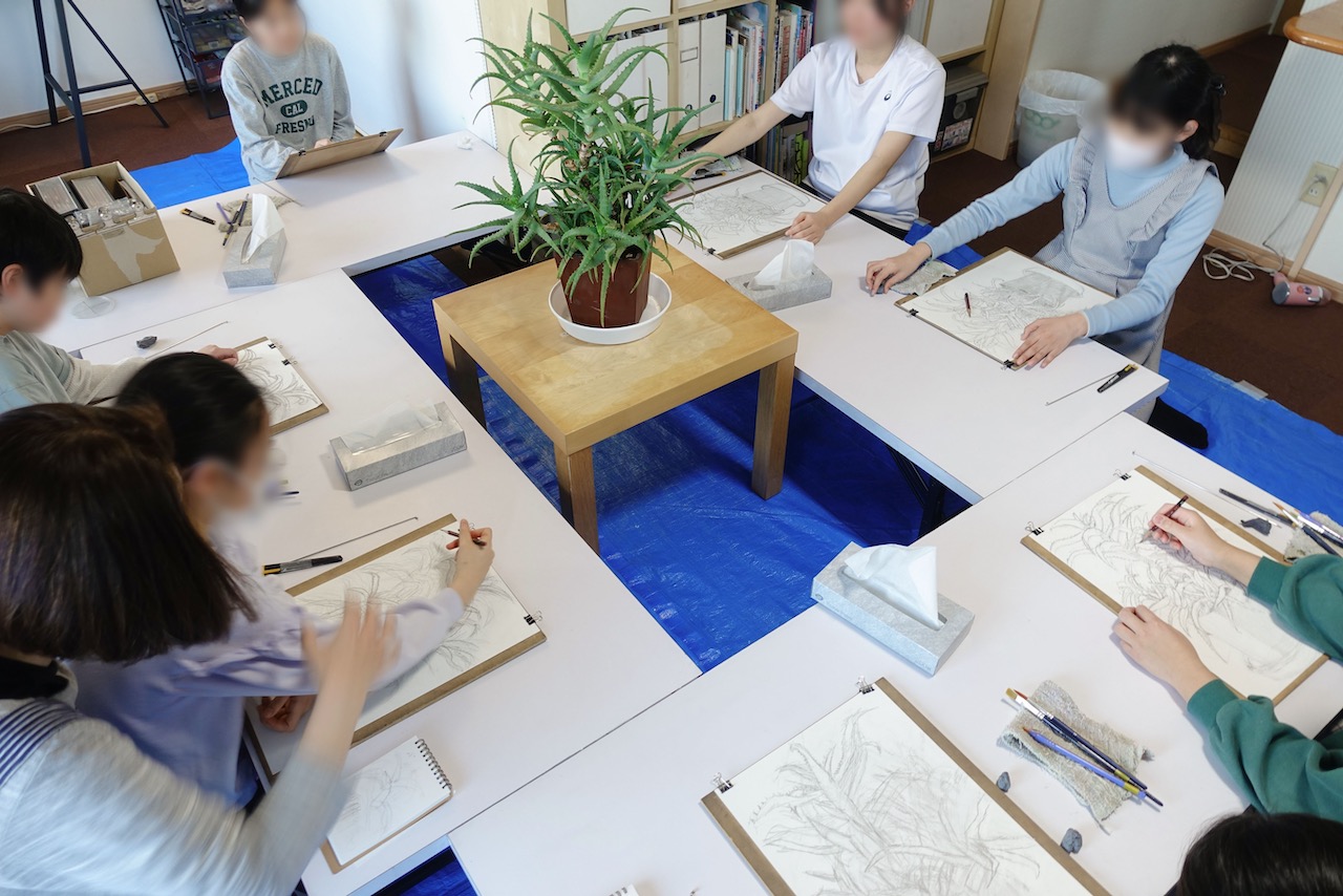 午後クラスの着彩は、鉛筆でのスケッチは今週まで。とにかく描き切ることが目標。そして更に形を正確に!特に鉢や皿などの人工物は形の狂いが一発でわかります。アロエも笹にならないよう、アロエらしい多肉のカーブした形態をよく観察して描きましょう。