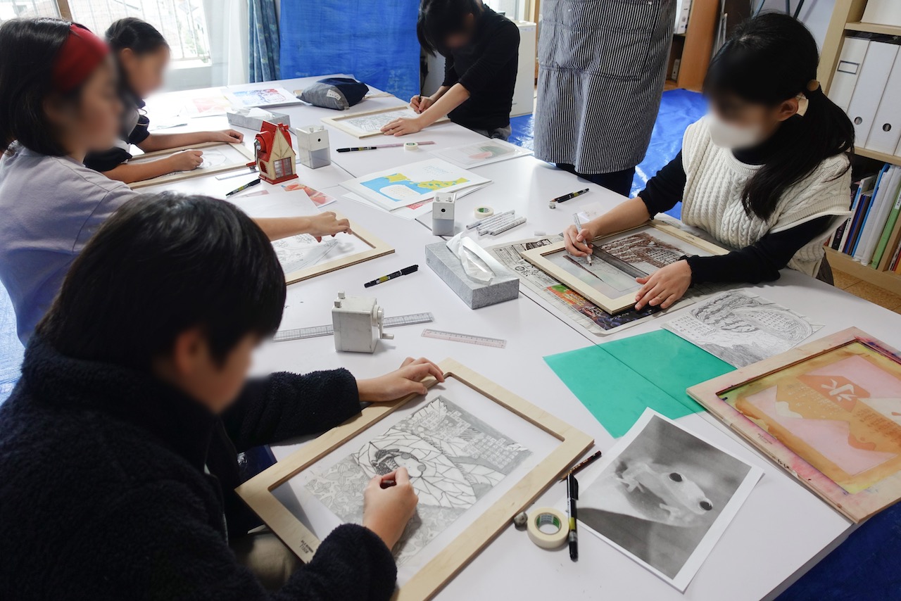 午後クラスはシルクスクリーンの製版に入りました。製版とは版を作ること。版は版画の版ですね。木版の場合は彫られた木板が版で、シルクスクリーンの場合はスクリーンが版になります。まずは下絵を鉛筆で写し、描画材で描いていきます。頑張りましょう〜。