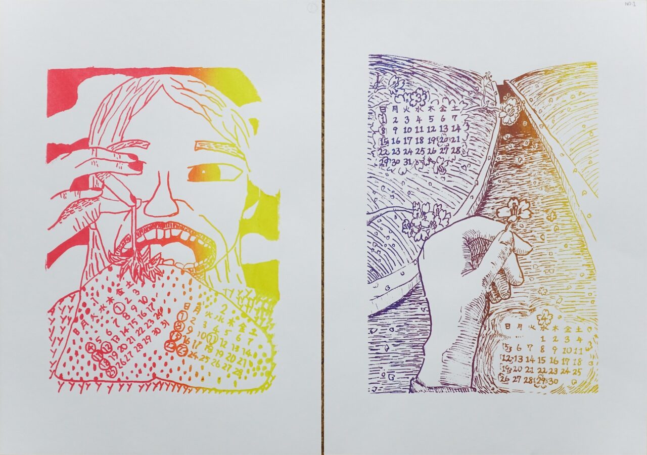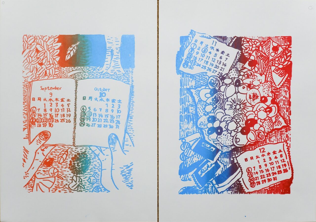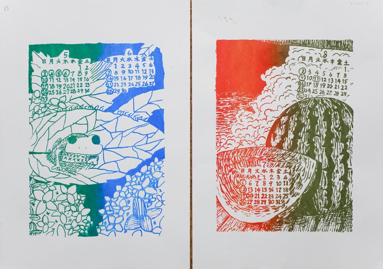 午後クラスのシルクスクリーンのカレンダーは完成しました〜。それぞれ色の取り合わせに個性があって綺麗ですね。マーカーでの描き込みもしっかり細部まで描いてあって、カレンダーとしての機能だけでなく「絵」として見応えがあります。よく頑張りました👏。
