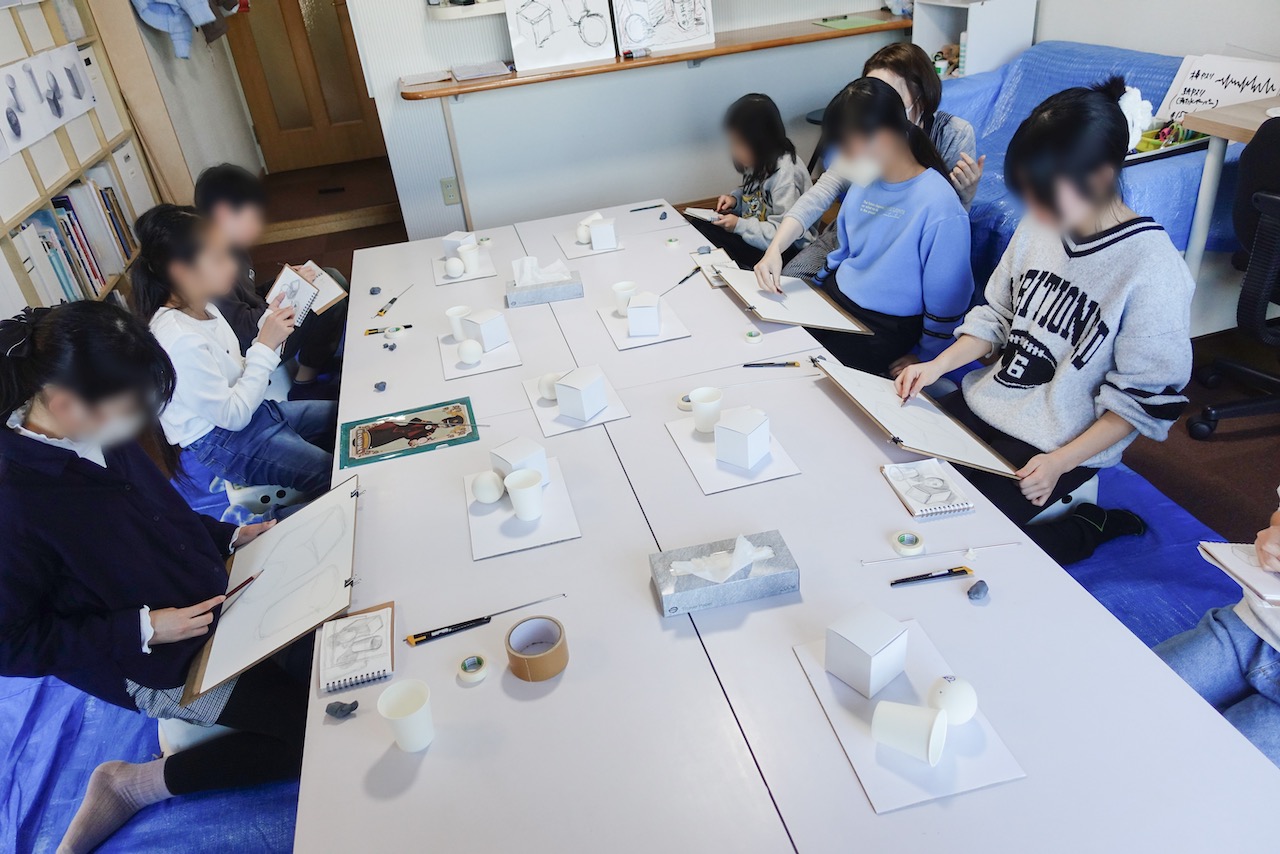 午後クラスは新しい課題。紙箱・紙コップ・軟式テニスボールの3つを使って自分でモチーフを組んで、デッサンをします。それぞれは立方体、筒型、球、と基本的な形ですが、3つ組み合わせると位置/奥行き/大小/隙間/光と影…と「関係」が生まれ、難易度が上がります。今週はモチーフを組み、エスキースをして構図を決め、本番の紙にアタリをとるまで。来週からよく見てよく描きましょう。