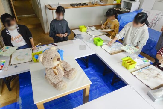 午前クラスは下描きを先週終えて、水彩絵の具で着彩に入りました。着彩は、水多め→水少なめ、広く→細部、暗部→明部を心がけて進めます。今週は水で薄く溶いた絵の具でさっと全体の雰囲気を捉えること、ぬいぐるみ1体にとらわれず、2体と床の影も平等にバランス良く進めていきます。