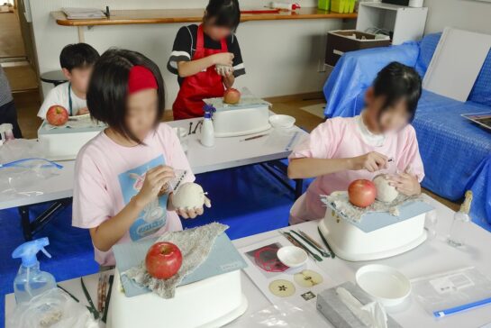 午後のリンゴの模刻は、少し駆け足でしたが今週で粘土作業は終了です。指だけで作ってもいびつなリンゴになってしまいますので、今週は道具を使います。彫刻では角材やヘラなど色々な道具を使うのですが、平らな面を作るのによく用いる「三角定規」を使って、リンゴのすべっとした面を作ります。ヘタも刺してひとまず完成。来週から着色に入りましょ〜う。