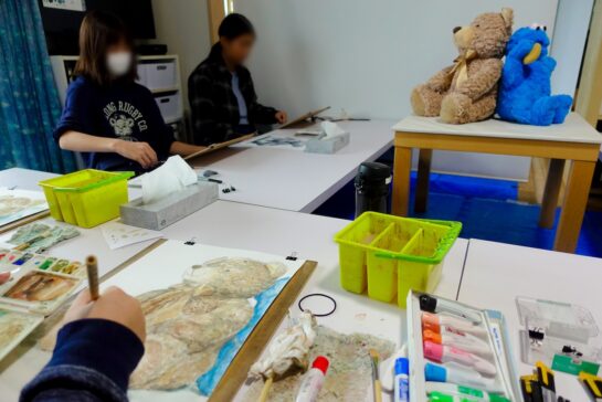 午前クラスのぬいぐるみの着彩も来週完成。毎度みんなに言ってますが、最終週前週で一旦完成を目指して、最後は更にもう一歩!自分の限界を越えるつもりで描きこみます。今回のぬいぐるみは実は結構難題だったよう😅で、細かい毛並みを明と暗で描きつつも、それだけにとらわれず、ぬいぐるみ全体の大きな明暗も意識しないと立体感が出ません。細部と全体、かつ色!まで同時に見て描くという、なんというマルチタスク!(本当は絵を描くこと自体マルチタスクなんですよね)。目と頭と手、ぜんぶのいい体操になります👀🧠💪。