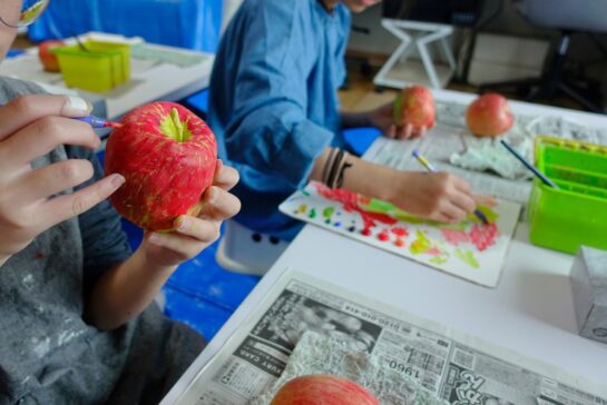 午後クラスのリンゴの模刻は今週、来週でアクリル絵具で着色をします。リンゴだからといって、いきなり赤くは描かないんです〜。リンゴが黄色から赤く色付いてくる自然の仕組みにのっとって、赤の下にある色を想像・観察しながら、まずベースの色を塗ります。その上から、面相筆でハッチングという手法で細かいタッチを重ね、焦らず少しずつ赤く色づけていきます。どんどんそっくりにしますよ〜。