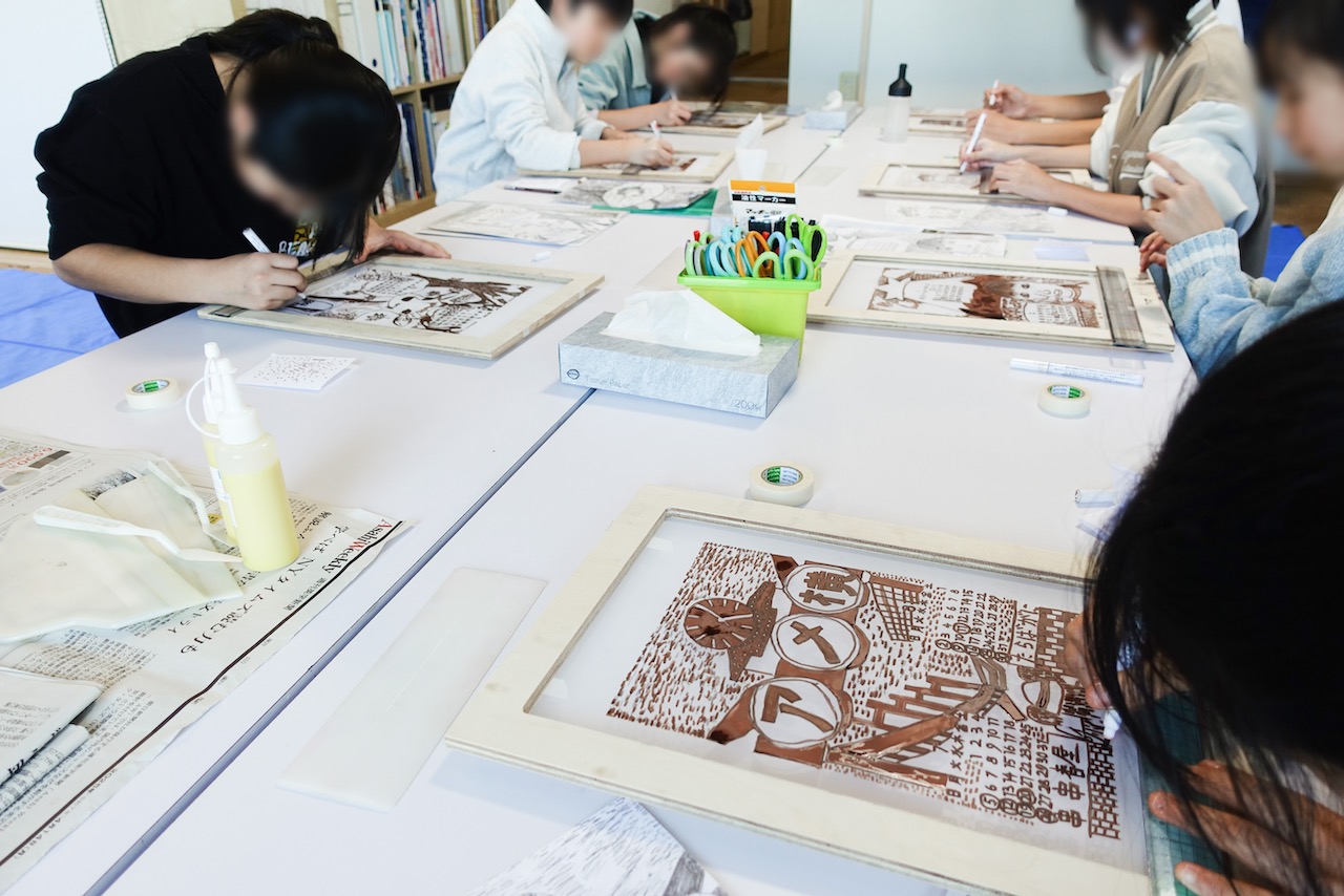 午後クラスは年末課題のカレンダーに入りました。今年はシルクスクリーンで作ります。1人1ページ(2ヶ月分)担当で、人数分刷って完成したら各家庭に配られます。「12月といったらサンタさん!」のような季節の固定観念に縛られず、自分の経験に引きつけたオリジナルな絵にするよう頑張ってね〜。